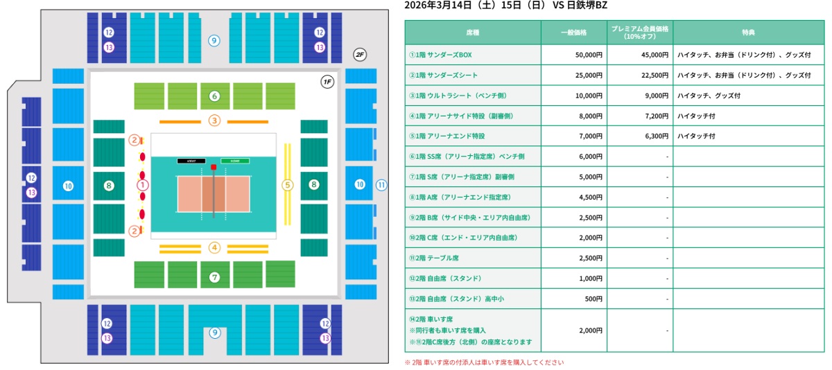 ※サンダーズBOX、サンダーズシート、ウルトラシート、アリーナサイド特設1列目、アリーナエンド特設は段差がないフロア直置きの座席となります。