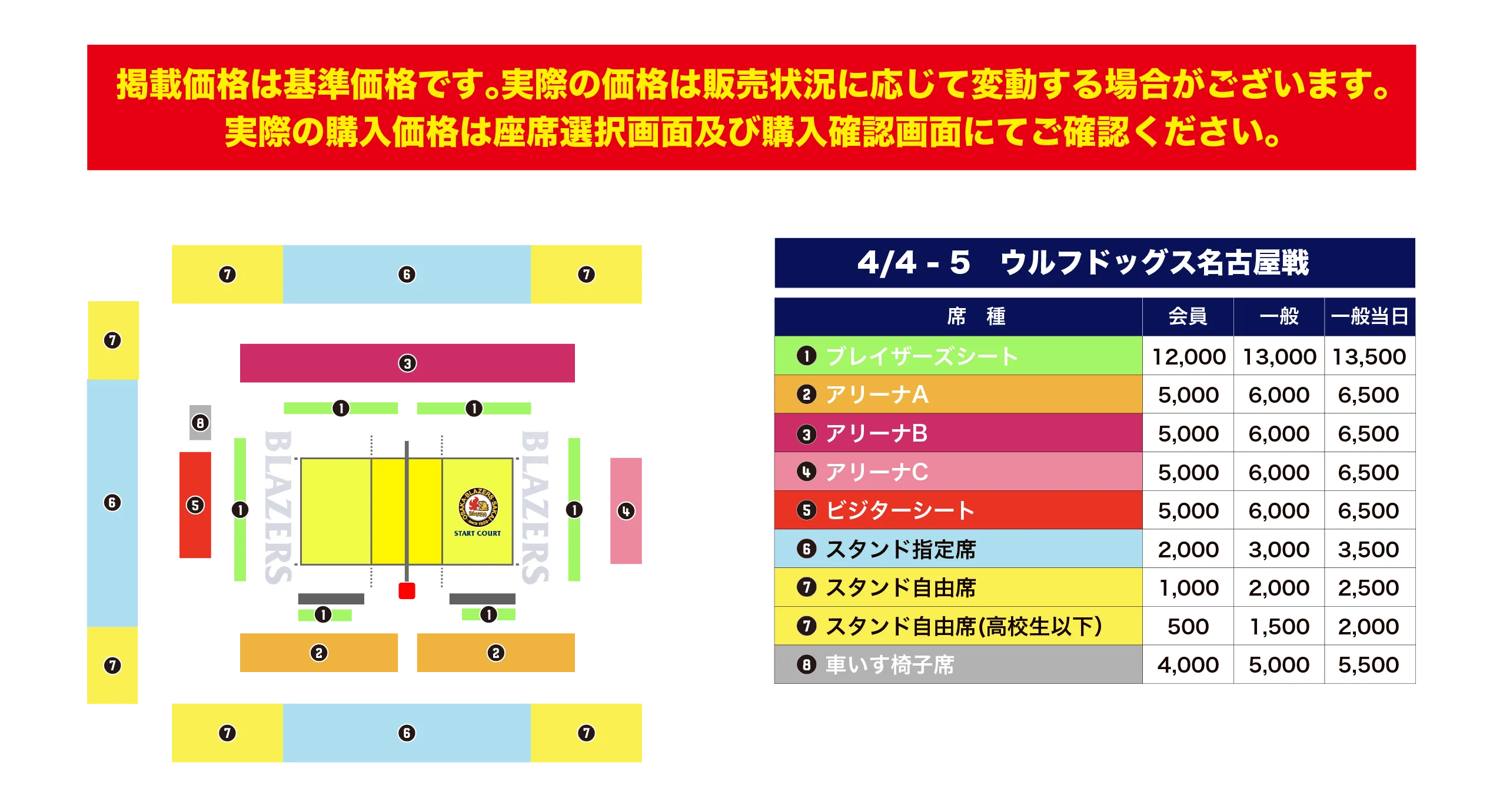 ・両チームベンチ裏側のお席やコート周辺のお席(BZシート、コートサイドシート、アリーナ各席種前列)については、選手やチームスタッフ、競技運営上の機材が観戦の妨げとなる可能性がございます。あらかじめご了承の上チケットをご購入ください。