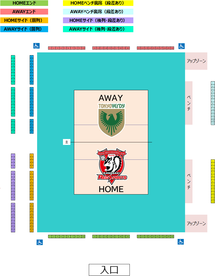 ・サイド後列(2列目)、ベンチ裏席は段差あり、机ありの席となります。
