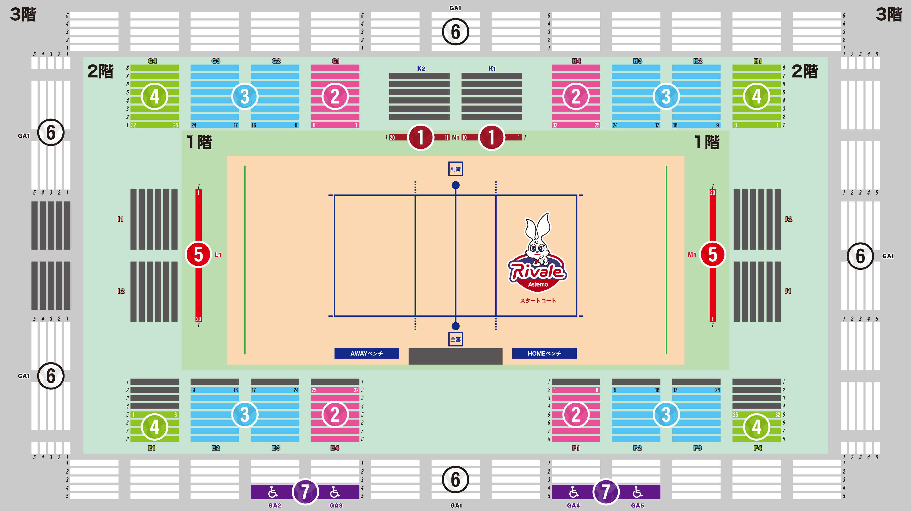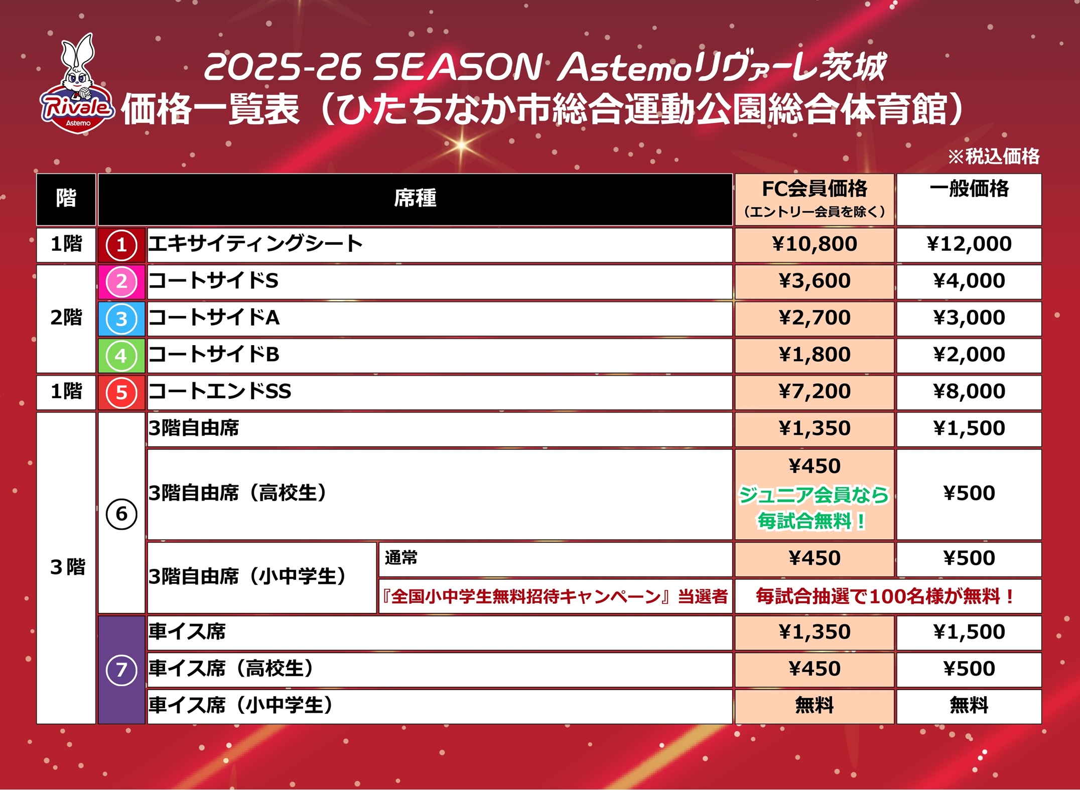 ※「3階自由席」は、RIVALE SUPPORTERS CLUBの「ジュニア会員」限定で、毎試合無料でチケットVより引換いただけます。詳細・ご入会はコチラ!(入会特典一覧の欄及び※3をご確認ください)
