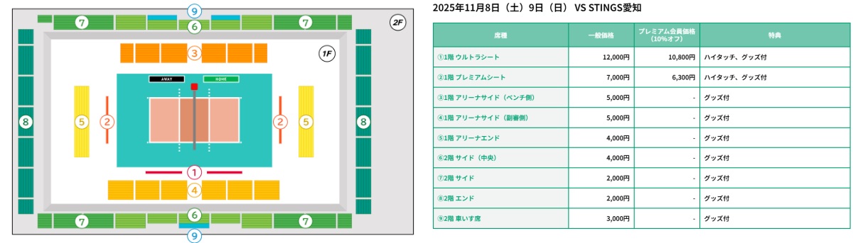 1Fアリーナサイド、1Fアリーナエンド、2Fサイド(中央)、2Fサイド、2Fエンド