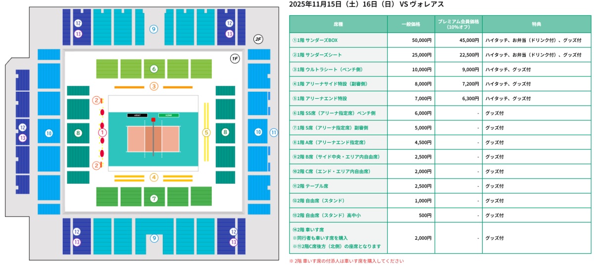 ※サンダーズBOX、サンダーズシート、ウルトラシート、アリーナサイド特設1列目、アリーナエンド特設は段差がないフロア直置きの座席となります。
