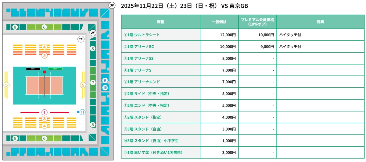 1FアリーナSS、1Fアリーナエンド、2Fサイド(中央・指定)、2Fエンド(中央・指定)、2Fスタンド(指定)、3Fスタンド(自由)