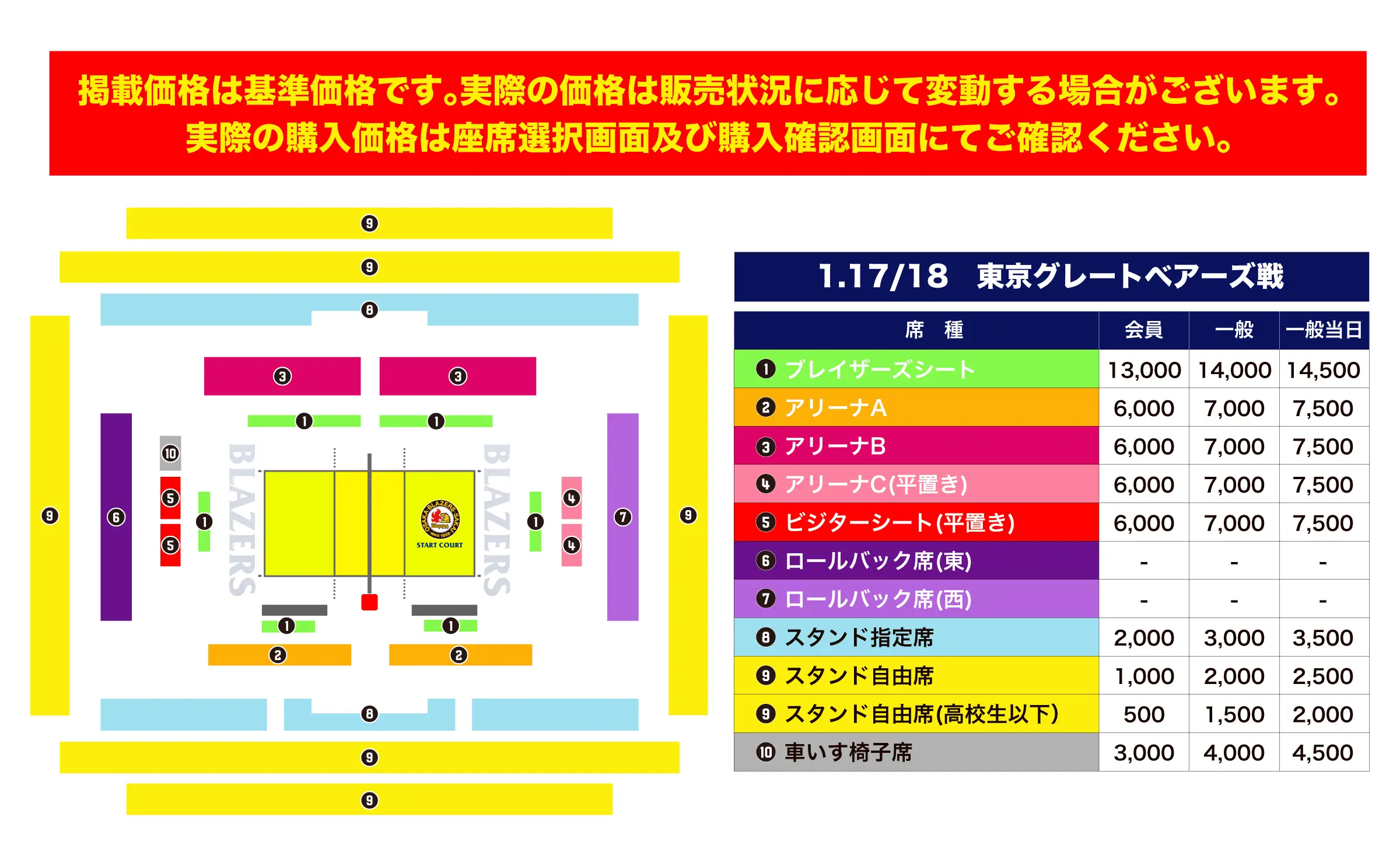 ・ベンチ裏側のお席やコート周辺のお席(BZシート、アリーナ各席種)については、選手やチームスタッフ、競技運営上の機材が観戦の妨げとなる可能性がございます。あらかじめご了承の上チケットをご購入ください。