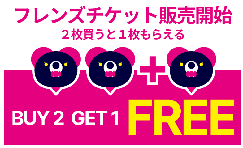 よりお友達やご家族を誘いやすくするために、該当のチケットを2枚購入すると1枚もらえるお得なチケットです!