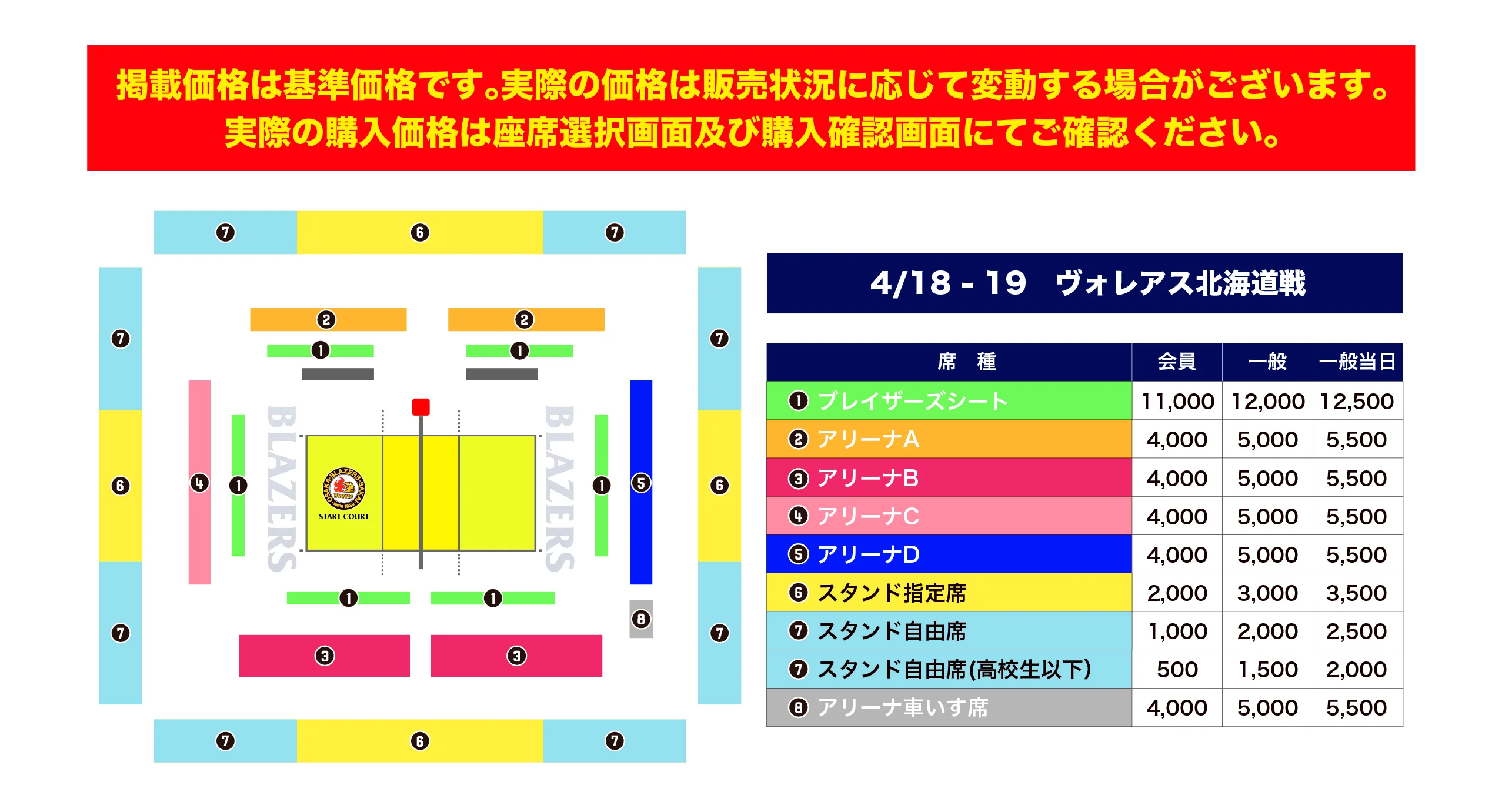 2025-26シーズンの日本製鉄堺ブレイザーズホームゲームのチケット販売価格は、これまでの固定制と異なり、座席や販売状況に応じて価格が変わる変動制を予定しております。